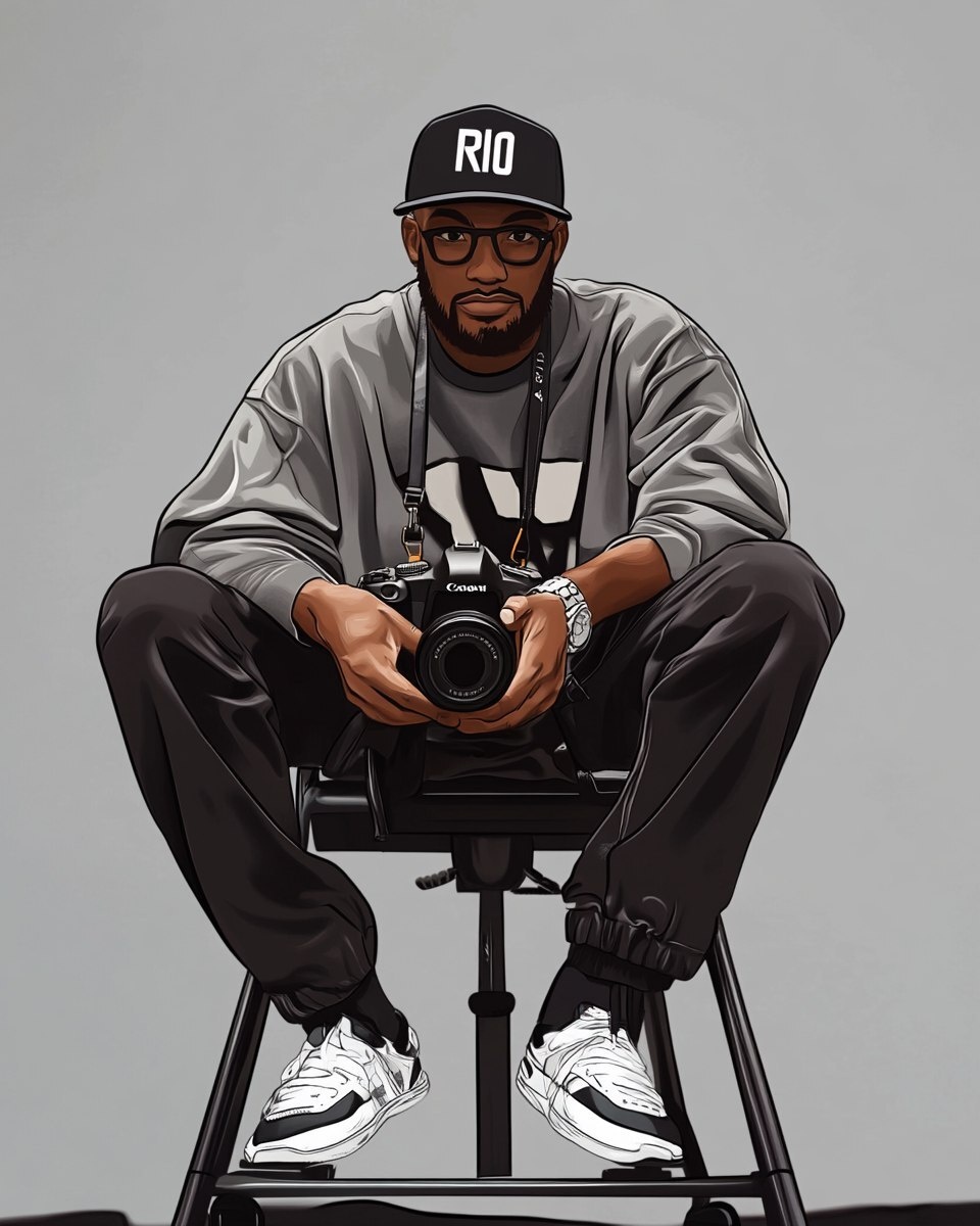 Создано на основе запроса: Recreate image in aAkira Toriyama style, the scene is perfectly symmetrical. Use the attached photo as a reference for the face. charecter is a photographer, holding canon R5 camera, keep clothes grey and black , sitting in director chair, anime, african american, snapback baseball cap backwards