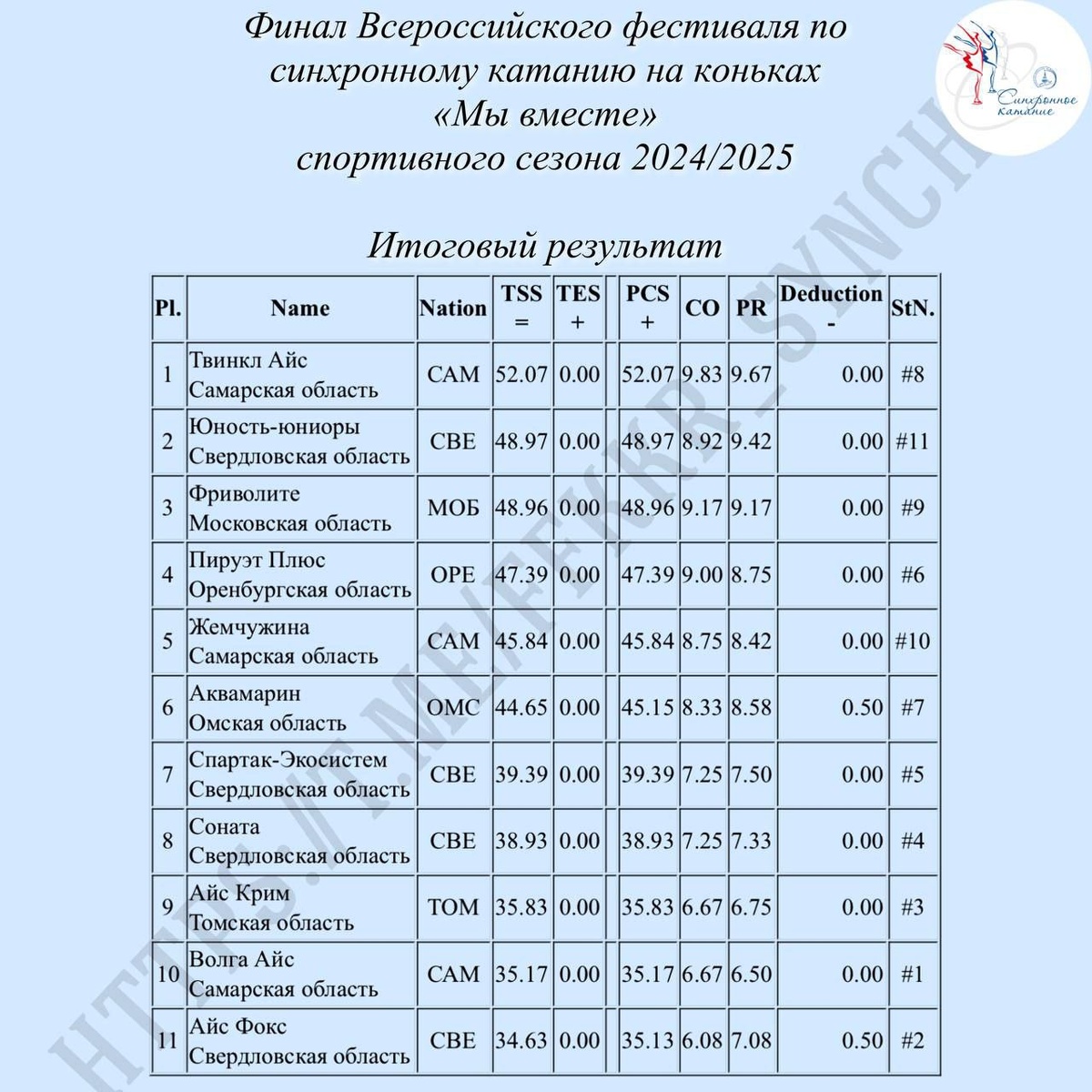 Результаты финала Всероссийского фестиваля по синхронному катанию на коньках «Мы вместе» спортивного сезона 2024/2025
