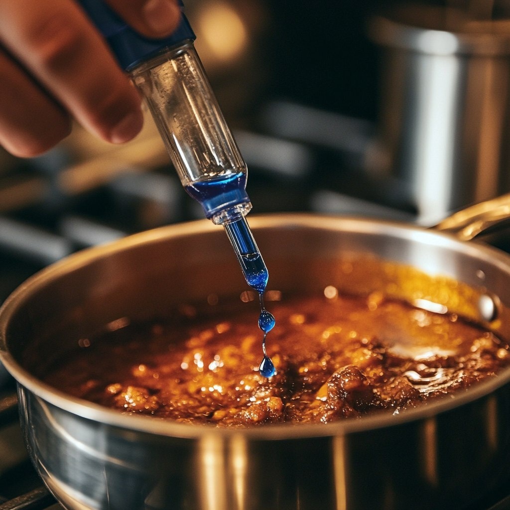 Создано на основе запроса: a close up of someone adding blue liquid drops from a dropper vial to a pot of sauce on the stove