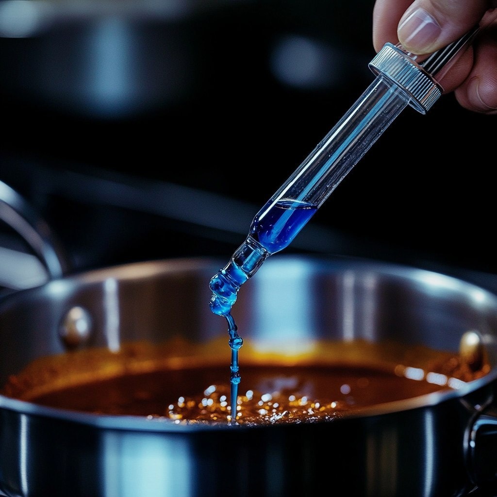 Создано на основе запроса: a closeup of a person adding blue liquid drops from a dropper vial with a thin tube, in a pot of sauce on a