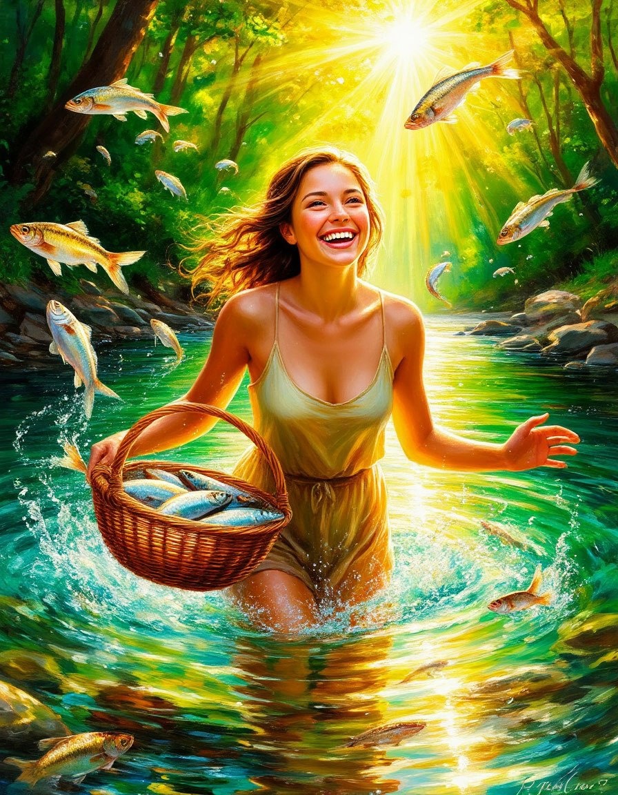 Доброе утро! a young woman wades through a crystal-clear river bathed in golden sunlight. Her radiant smile reflects pure joy as she carries a basket filled with shimmering fish, while others appear to leap magically through the air around her. The warm glow of the sun filters through the lush green forest, creating a dreamlike harmony between nature and human spirit. The painting exudes a sense of freedom, peace, and connection to the wonders of the natural world. #neuroart #нейроарт #ai #ии #нейросеть #картинки #искусственныйинтеллект #цифровоеискусство #digitalart #арт #art #prompt #промпт #подсказка
