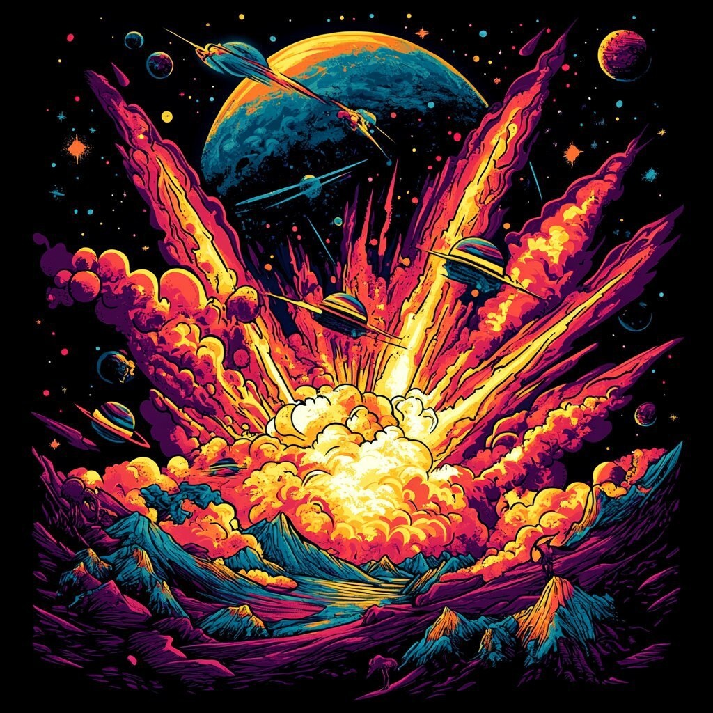 Создано на основе запроса: A cosmic explosion with vivid colors and alien creatures in the background, creating a surreal and otherworldly