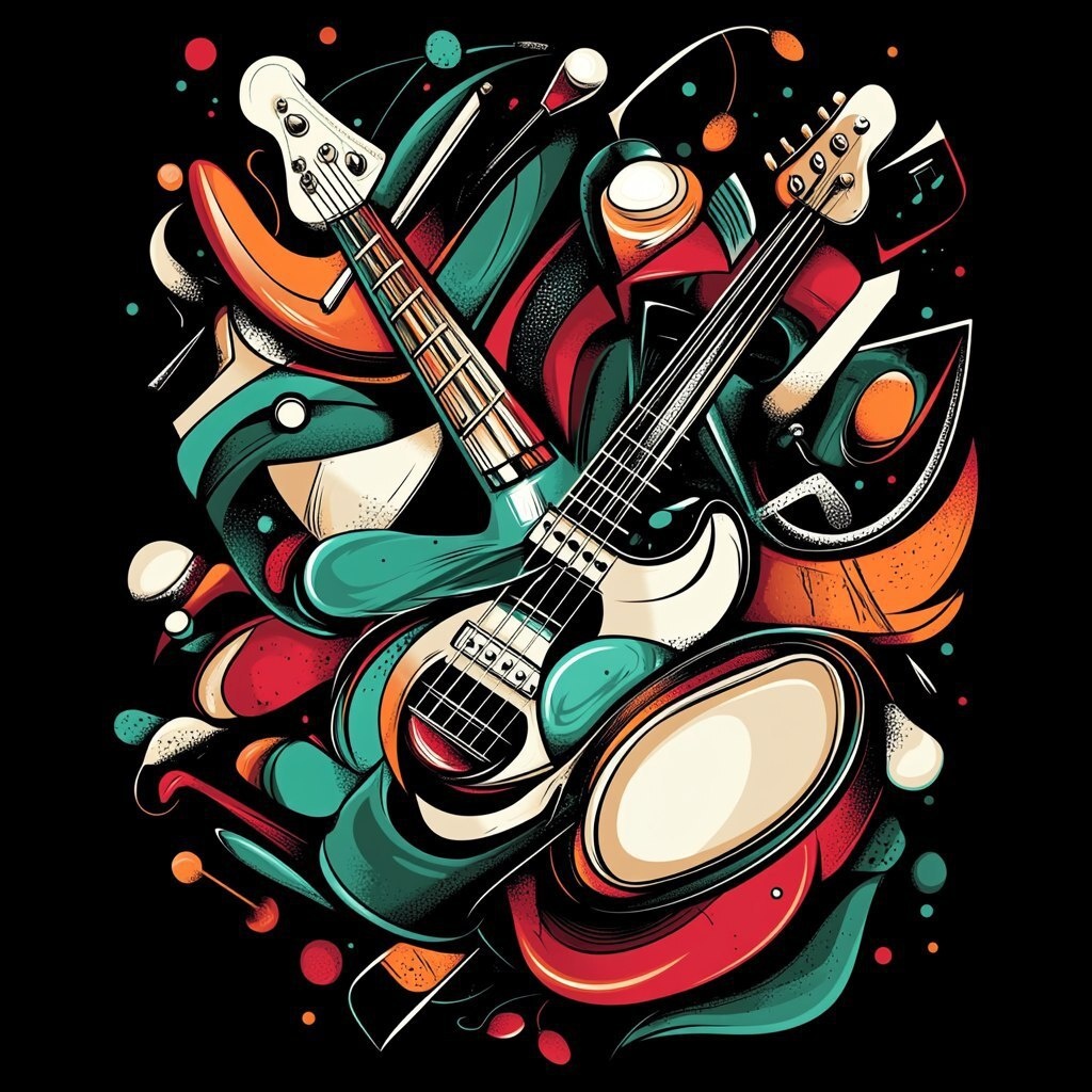 Создано на основе запроса: Musical instruments like guitars and drums with distorted, irregular lines and broken shapes, forming an