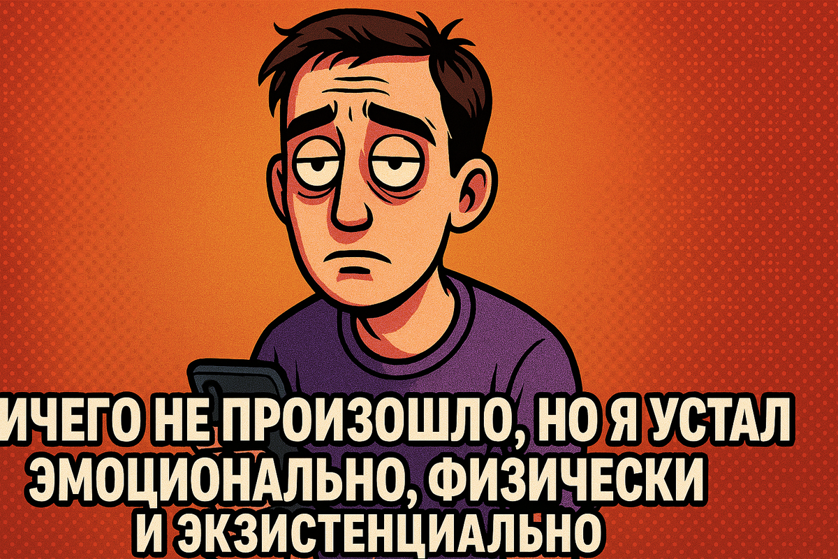 «Ничего не произошло, но я устал эмоционально, физически и экзистенциально» Иногда день проходит, и ты оглядываешься — и… ничего. Ты не был на пробежке, не выучил язык, не освоил инвестиции. Ты даже посуду не помыл. И всё бы ничего, но чувствуешь себя так, будто тащил на себе вагон с кирпичами, а потом ещё два часа давал интервью на тему смысла жизни, только в своей голове. Ты проснулся — не с утра, а как бы из тумана. Открыл глаза, посмотрел в потолок, потянулся и… уже устал. Хотя, казалось бы, организм ещё не имел права. — сделать зарядку? ну может с понедельника; — почистить почту? потом, вдруг там плохие новости; — приготовить еду? а зачем, если есть хлеб и чувство апатии. Ты включаешь ноутбук, чтобы "начать день", и в этот момент наступает ловушка: ты вроде бы в процессе, но ничего не происходит. Ты как будто в Лимбо. Ни там, ни тут. Ни работаешь, ни отдыхаешь. Просто плывёшь в вязкой невидимой жижице, где каждое действие требует согласования с внутренним комитетом мотивации. А та