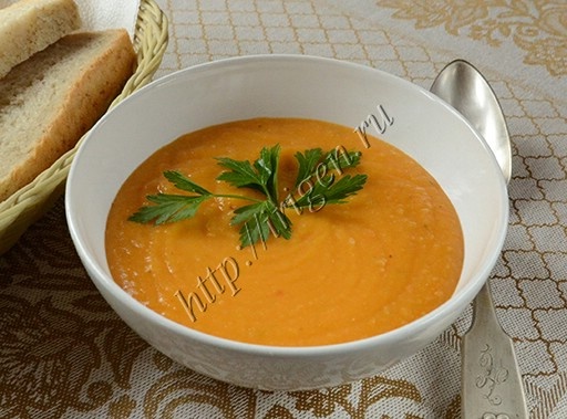 Постный гороховый суп-пюре с добавлением тыквы. (из расчета на двухлитровую кастрюлю) Горох замочить в холодной воде на ночь. Затем слить воду, горох промыть и сложить в кастрюлю. Залить водой и поставить на огонь. Варить около часа, пока горох не начнет развариваться. Очистить картофель и тыкву. Нарезать небольшими кусочками. Добавить кусочки картофеля и тыквы в кастрюлю с горохом. Слегка посолить и варить на слабом огне. Опустить помидор на 1-2 минуты в кипящий суп. Вынуть помидор, обдать его холодной водой и очистить от кожицы. Нарезать помидор кусочками и положить в суп. Можно вместо помидора добавить томатное пюре. Лук мелко нарезать. Морковь нарезать кусочками. В сковороду налить растительное масло и нагреть. Слегка обжарить лук на растительном масле. Затем добавить морковь. Немного обжарить и добавить содержимое сковороды в кастрюлю с супом. Посолить по вкусу, добавить перец и майоран. Варить суп до готовности картофеля и тыквы. Затем снять с огня. Блендером или миксером измель