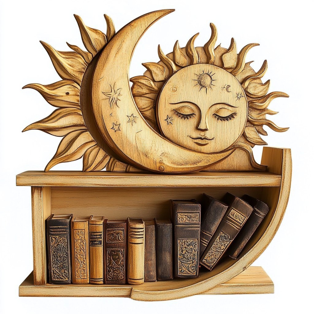 Создано на основе запроса: wooden book shelf celestial moon and sun shaped,white background