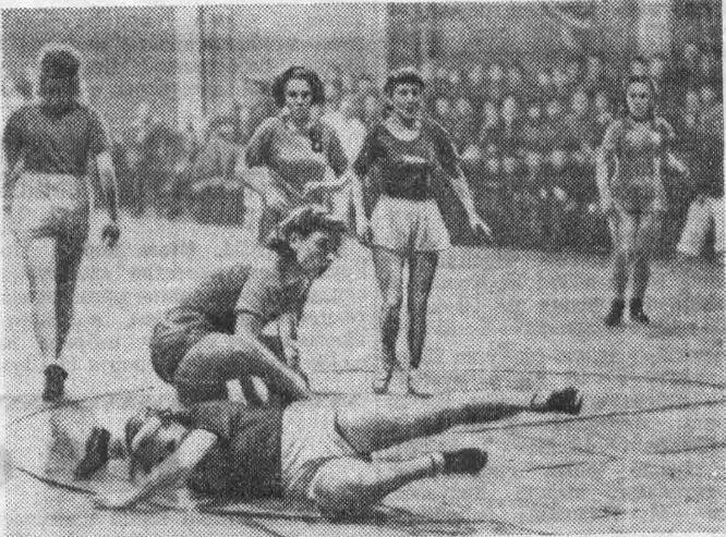 9 марта 1947. Москва. Зал спортклуба «Крылья Советов». Игра VIII Матча городов СССР Москва — Баку — 46:20. Капитан сборной Москвы Мария Козлова (справа) борется за мяч с Фоминой из Баку