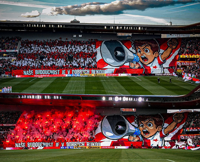 Откроем сегодняшний обзор давно полюбившимися нами фанатами пражской «Славии», которая в очередном туре чемпионата Чехии принимала на своем поле «Градец-Кралове». Задолго до игры столичные болельщики объявили, что для создания перфоманса к этой игре они привлекут детей — на сегодняшний момент это является уже устоявшейся традицией, когда взрослые ультрас приводят на стадион своих детей, братьев, сестер и племянников, вместе с которыми и создают будущую красоту на трибунах. Ранее юные поклонники уже создали перфы с Бартом Симпсоном и миньонами, теперь же пришел черед посвятить баннер непосредственно его создателям, то есть самим детям. На полотне, которое в итоге заняло примерно половину северной трибуны стадиона «Эден», был изображен ребенок в качестве заводящего, а подпись к нему гласила «Наше будущее в надежных руках».