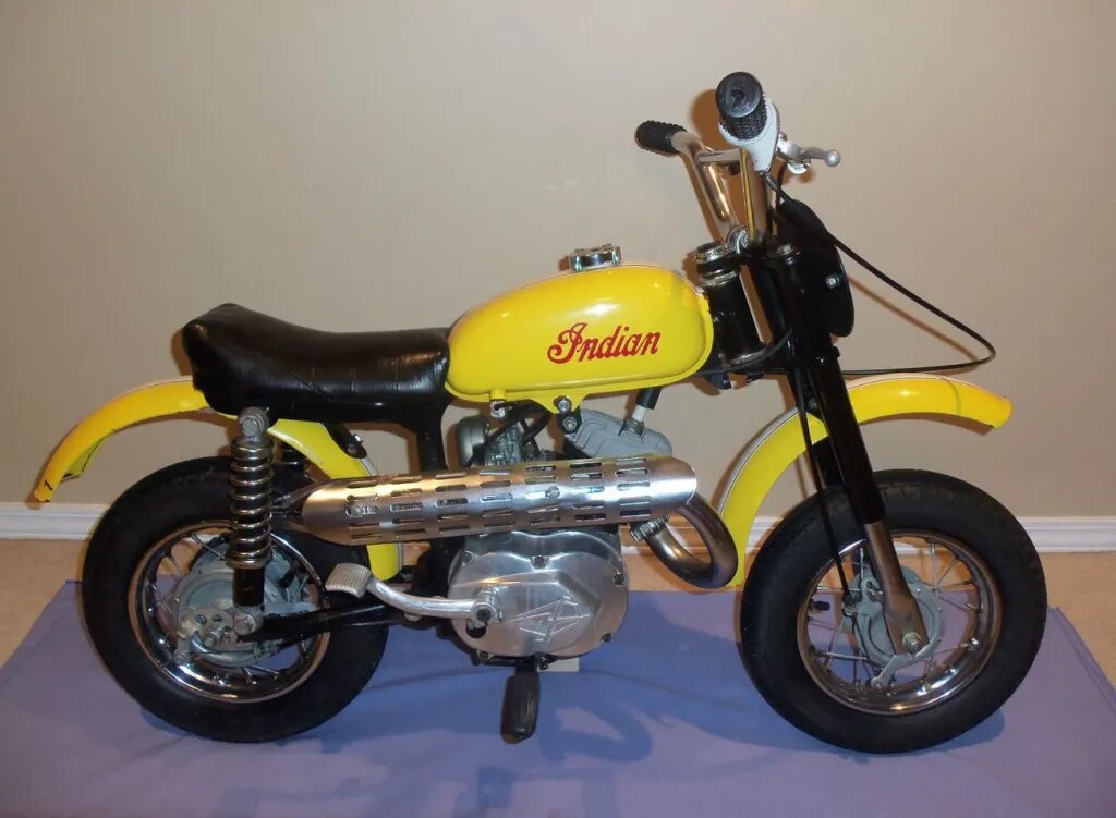 Indian MM5A, также известный как Indian Mini Bambino, был мини-байком, разработанным для маленьких детей (4-5 лет), чтобы они могли познакомиться с мотоциклами и брендом Indian. У этого мотоцикла было две маркетинговые цели — побудить старших гонщиков поделиться опытом Indian со своими детьми, а также подготовить следующее поколение гонщиков к выбору мотоциклов Indian. Вспомогательные колеса были дополнительной опцией, которую можно было установить либо на ось, либо на болт крепления амортизатора. Если вы выбирали последний вариант, мотоцикл все еще можно было наклонить примерно на 25 градусов, прежде чем колеса коснутся мотоцикла. Все в этом мотоцикле маленькое. Максимальная скорость составляла 16-20 км в час — так медленно, потому что впускной коллектор был абсолютно крошечным. Двигатель — 50-кубовый агрегат, произведенный Morini, выдающий всего 1,5 лошадиных силы. Он весил всего 25 кг и был оснащен центробежным сцеплением, без трансмиссии. У вас был "газ" и два ручных тормоза, по
