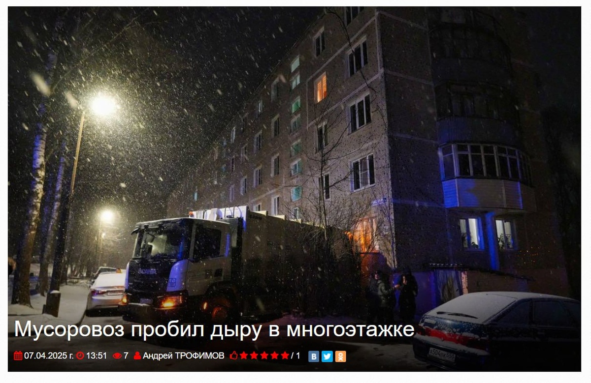 Мусоровоз пробил дыру в многоэтажке Сергиева Посада, о чем подробнее по ссылке у меня на сайте "Альтернативной газеты Андрея Трофимова