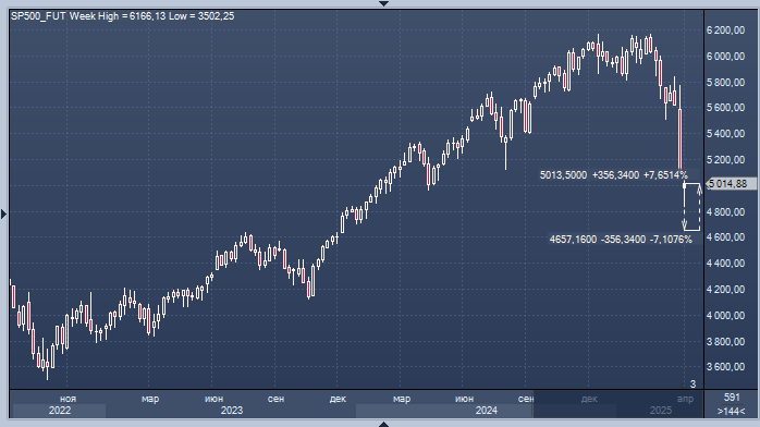 График фьючерса на индекс S&P 500 интервалами в 1 неделю По мнению экспертов Morgan Stanley, инвесторам стоит готовиться к тому, что индекс S&P 500 может упасть ещё на 7–8%, если опасения по поводу торговых тарифов не исчезнут, а Федеральная резервная система США (ФРС) не изменит свою позицию. Специалисты под руководством Майкла Уилсона считают, что оценки будут лучше поддерживать индекс, если он приблизится к 200-недельной скользящей средней, которая составляет 4700. Они отмечают, что опасения по поводу торговых тарифов, скорее всего, приведут к дальнейшему снижению доходов и увеличат вероятность рецессии. Однако остаётся неясным, насколько эти опасения уже учтены в ценах. Ожидается, что компании с малой капитализацией продолжат отставать от компаний с большой капитализацией из-за их большей подверженности макроэкономической неопределённости, замедления роста прибыли на акцию и тенденции к отставанию в условиях позднего цикла, как отмечают стратеги в своей аналитической записке для кл