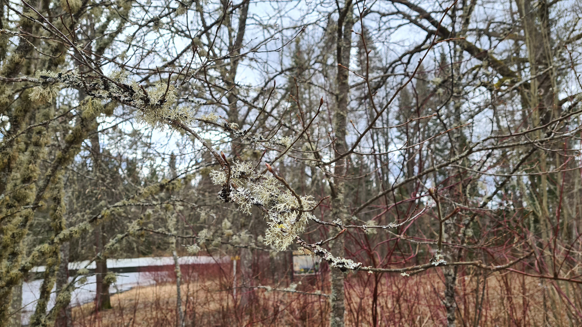 Кора и ветви деревьев сплошь покрыты лишайником: