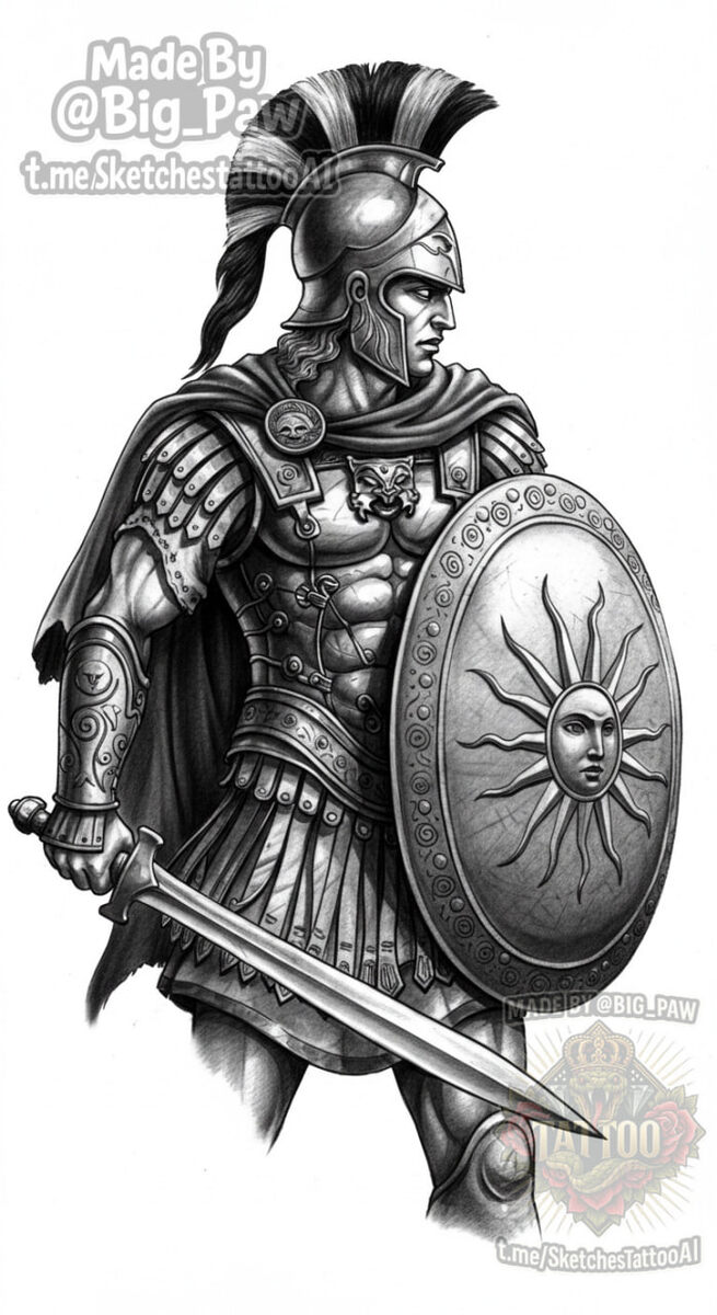 #2213 Подборка по запросу подписчика - I was wondering if maybe you could make realistic high contrast images of Alexander the Great, with the Macedonian sun symbol on a shield and swords maybe. 🧠 SYNTX 💳 Донат 😎 НейроБро 💀 Эскизы от нейросети #александрвеликий #македонский #реализм #эскизы #тату #татуировки