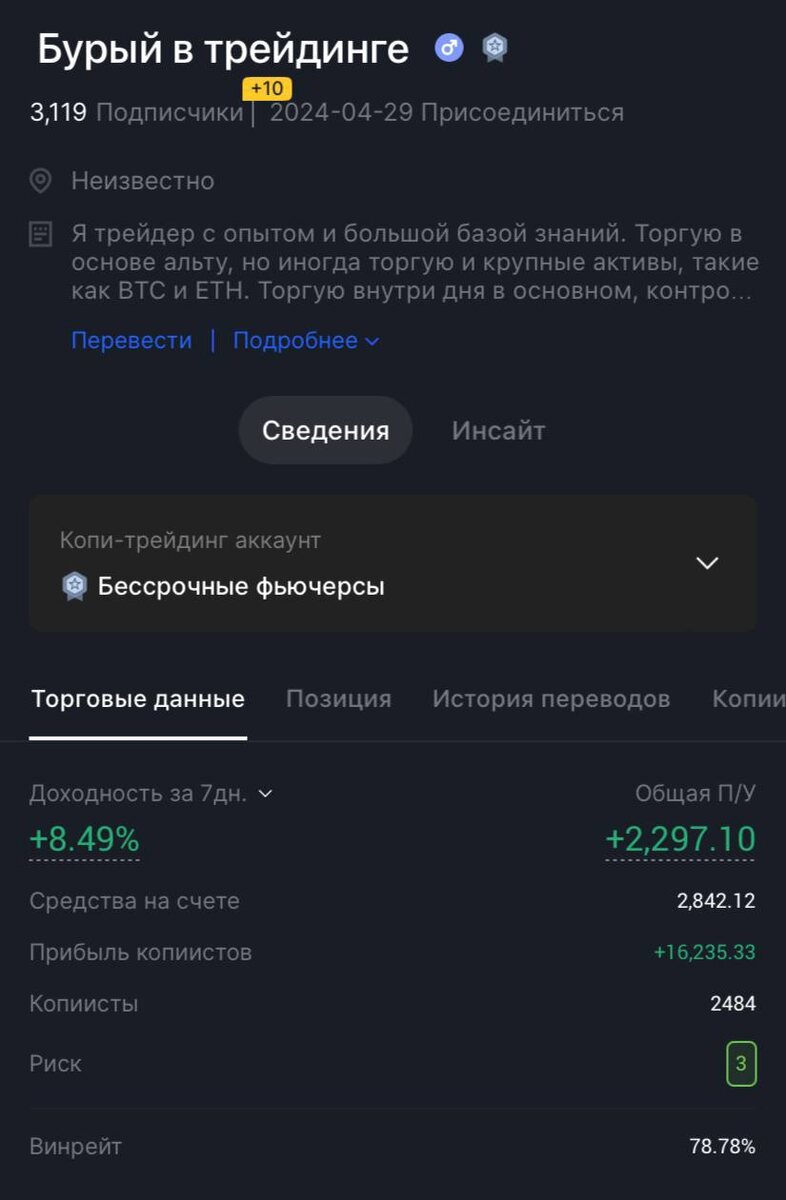 Рынок падает — я в плюсе. Рынок растёт — я в плюсе. Рынок стоит — я думаю, где взять ещё плюса. +8.49% за неделю. +2297$ в профит. 2 484 кописта уже копируют. Остальные пока «анализируют». Сидят с RSI, MACD и тревожностью. --- 78.78% винрейта. Это не магия. Это статистика. Хотя местами — похоже на фокус. Типа: «Опа, минус у всех… А у меня плюс. Та-дааа.» --- Тут нет гуру, нет обещаний. Тут есть сделки. Рабочие. С плечом. И с умом. Так что выбирай сам: — смотреть, как копилку набивают другие — или нажать кнопку и сказать: «всё, я с Бурым» Потому что деньги любят тишину. Но ещё больше — тех, кто умеет зайти на самом дне и выйти на хаях.