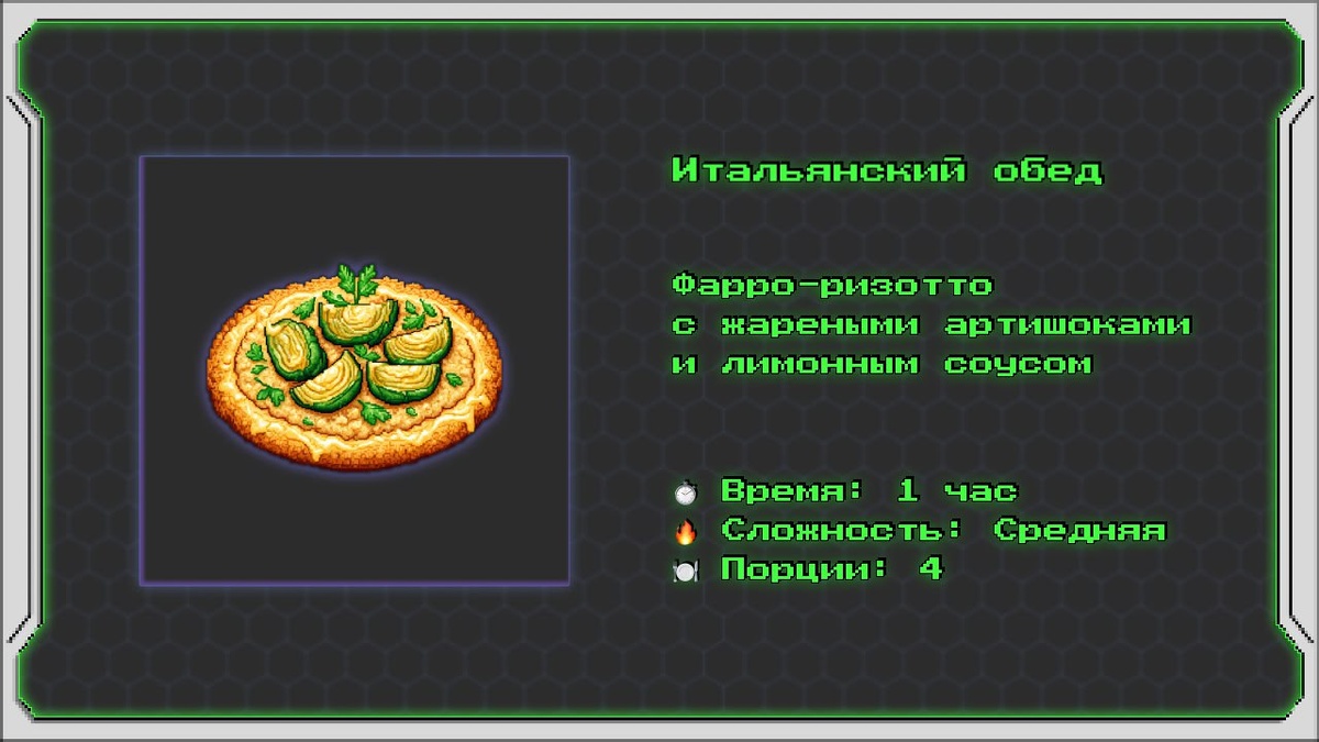 Итальянский обед Фарро-ризотто с жареными артишоками и лимонным соусом Этот рецепт представляет собой креативную интерпретацию классического ризотто, где вместо традиционного риса используется фарро (древний вид пшеницы). Блюдо дополняется жареными артишоками и лимонным соусом, что создаёт свежий и насыщенный вкус для обеда. Информация о рецепте: ⏱️ Время: 1 час 🔥 Сложность: Средняя 🍽 Порции: 4 Ингредиенты: Для фарро-ризотто: • 🍚 Фарро (перловая пшеница) — 300 г • 💧 Овощной бульон — 1 литр • 🫒 Оливковое масло — 3 столовые ложки • 🌿 Шалфей свежий (рубленый) — 1 столовая ложка • 🧂 Соль — по вкусу • 🌶 Молотый чёрный перец — по вкусу Для жареных артишоков: • 🥬 Артишоки (очищенные и нарезанные дольками) — 2 штуки • 🫒 Оливковое масло — 2 столовые ложки • 🌿 Чеснок (измельчённый) — 2 зубчика • 🧂 Соль — по вкусу Для лимонного соуса: • 🍋 Лимонный сок — 2 столовые ложки • 🫒 Оливковое масло — 2 столовые ложки • 🌿 Петрушка свежая (рубленая) — 1 столовая ложка • 🧂 Соль — щ