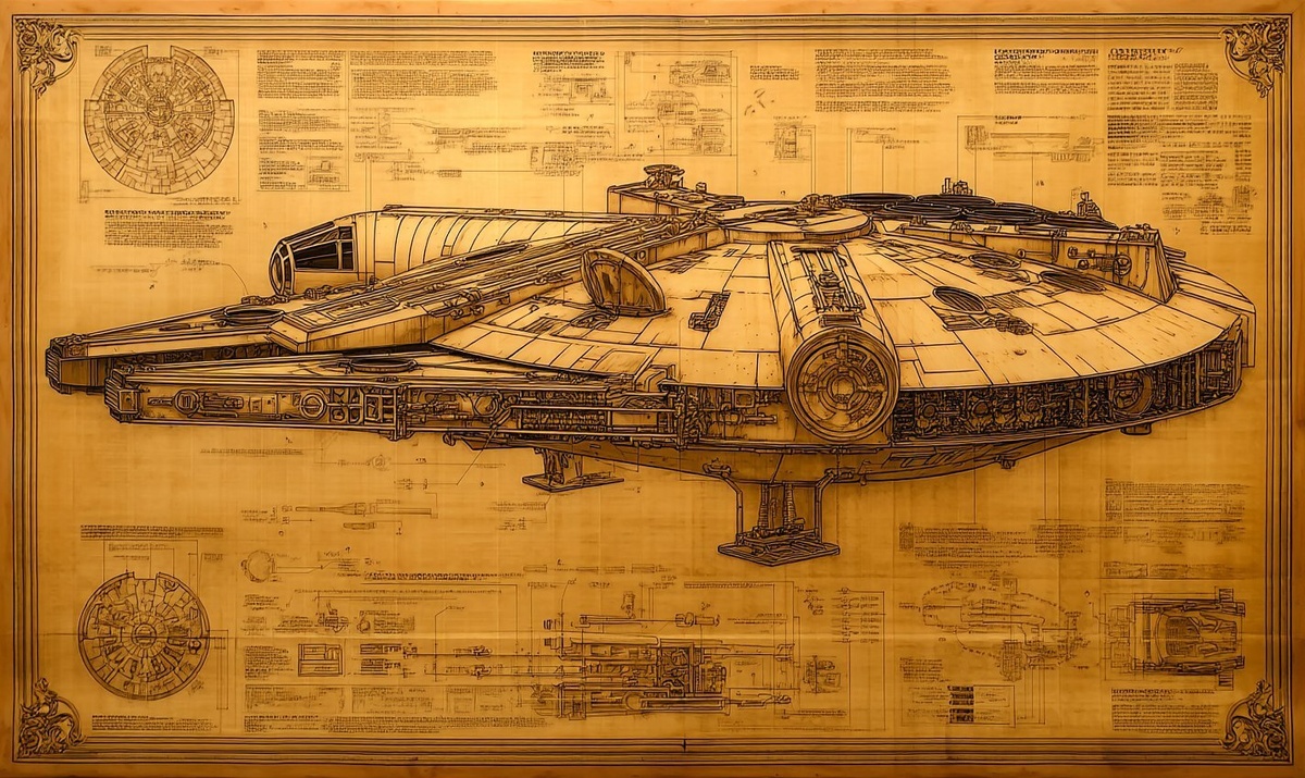 Создано на основе запроса: the millennium falcon, from star wars, schematics, side view, in extremelly detailed instructions of an