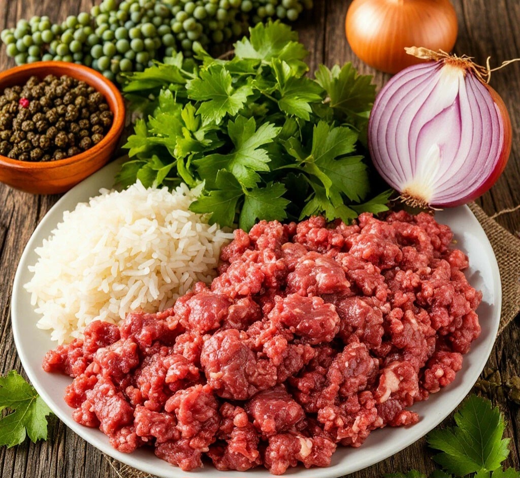 В миске смешайте фарш, рис, лук, чеснок, зелень, томатную пасту и специи.