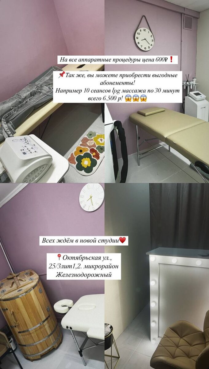 🎉Мы открываем ещё одну Спа студию коррекции фигуры и массажа по адресу: 📍Октябрьская ул., 25/3лит1,2. микрорайон Железнодорожный! . На все аппаратные процедуры цена 600₽❗️ ✅LPG массаж ✅Кавитация ✅RF лифтинг лица и тела ✅Прессотерапия ✅ФитоБочка ✅Биофотон ✅Вибромассаж ✅Пилинг тела и обёртывание Все виды массажа 💆🏻♀️ 📎массаж спины 1.300₽ общий массаж 2.500₽ 🔥 . 📌Так же, вы можете приобрести выгодные абонементы! Например 10 сеансов LPG массажа по 30 минут всего 6.500₽😱😱😱 Записывайся уже сейчас🤗 🖊️Сайт для записи: https://spa.rubitime.ru/ Телефон 📱 для записи: +7 (993) 365-10-97 +7 995 900-10-97