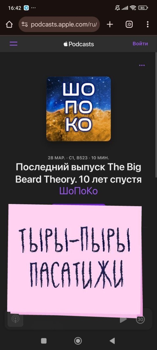 Грустно наблюдать смерть теории большой бороды, и ее перерождение в ШоПоКо, но Антон уже довольно давно к этому шел. Не скажу, что слушал много, всё-таки новости — это не моя история. Но ощущение крепкого форварда на этом поле, чувство плеча... Эх, в общем. Ну, штош, теперь я в русских подкастах главный по космосу. Будем соответствовать)
