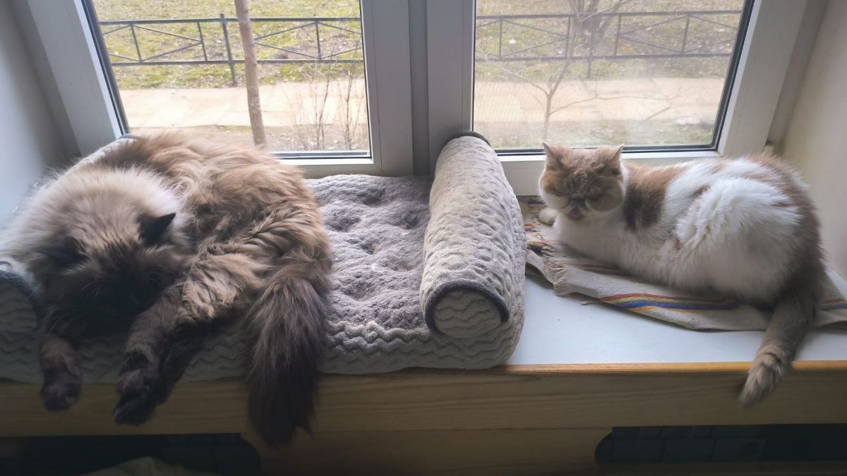 В гостях у Монечки. 🐈 Еженедельная рубрика новостей. 🗒 Начало - ЗДЕСЬ Все статьи о котике - ЗДЕСЬ Цитирую Юлию: "У нас похолодало, но снегом нас не засыпало. Всё таяло, не долетая до земли. Коты на похолодание не среагировали, только мы расстроились. Котики стали требовать больше сухого корма. Что уж их на это сподвигло - не знаю. Теперь требуют его каждый вечер, и побольше. Сегодня, во время утреннего вычёсывания Бени, пришел Сеня, улёгся рядом. Пришлось двумя руками двух котиков вычёсывать. Снимать это рук уже не было. А вчера удалось снять, как Моня умывал Сеню. Какой же Моняшенька у нас нежный котик❤️ Младший сын с девушкой уехали на несколько дней в Москву, у меня на попечении осталась чудесная троица. Удивительные хвостатые. Очень контактные, посторонних не боятся. Всех нужно накормить и обязательно наладить, а то из дома не выпустят.