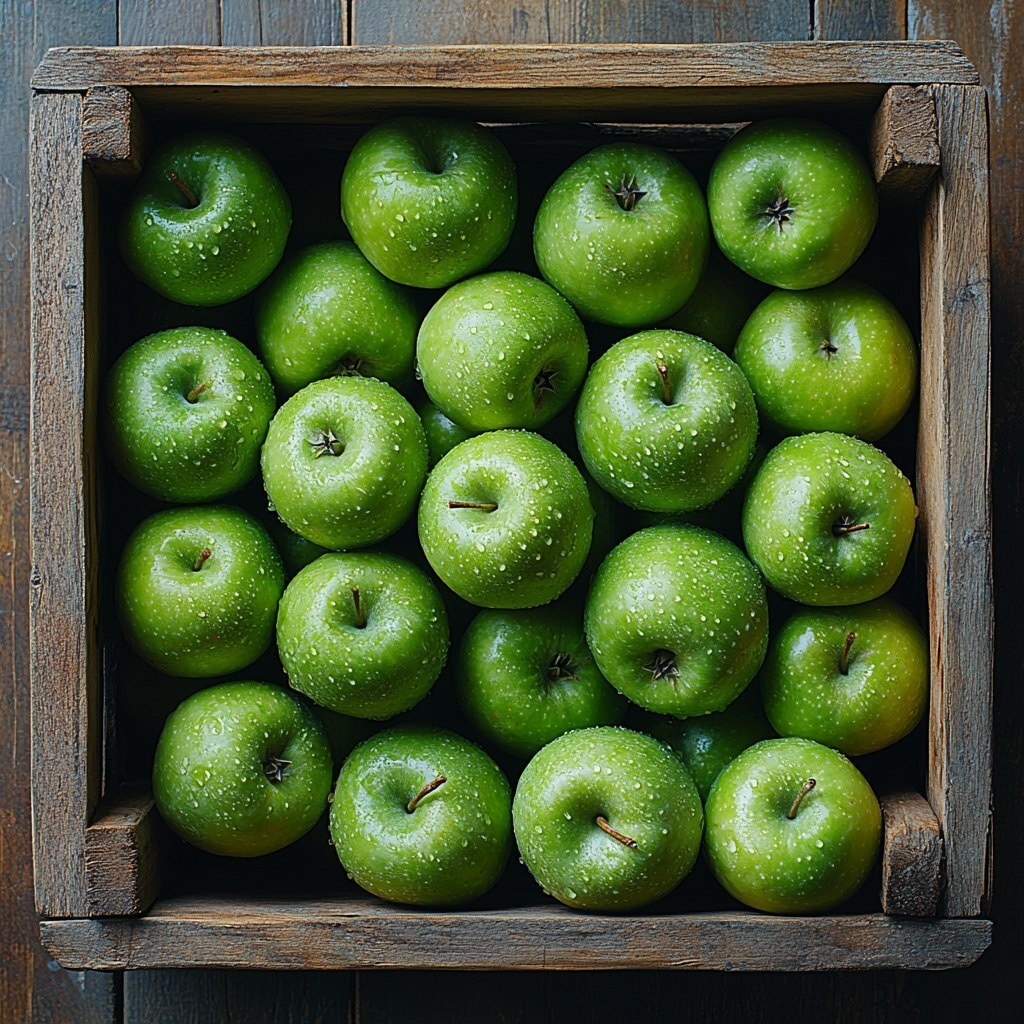 Создано на основе запроса: A box brimming with green apples, scattered wildly and seen from above
