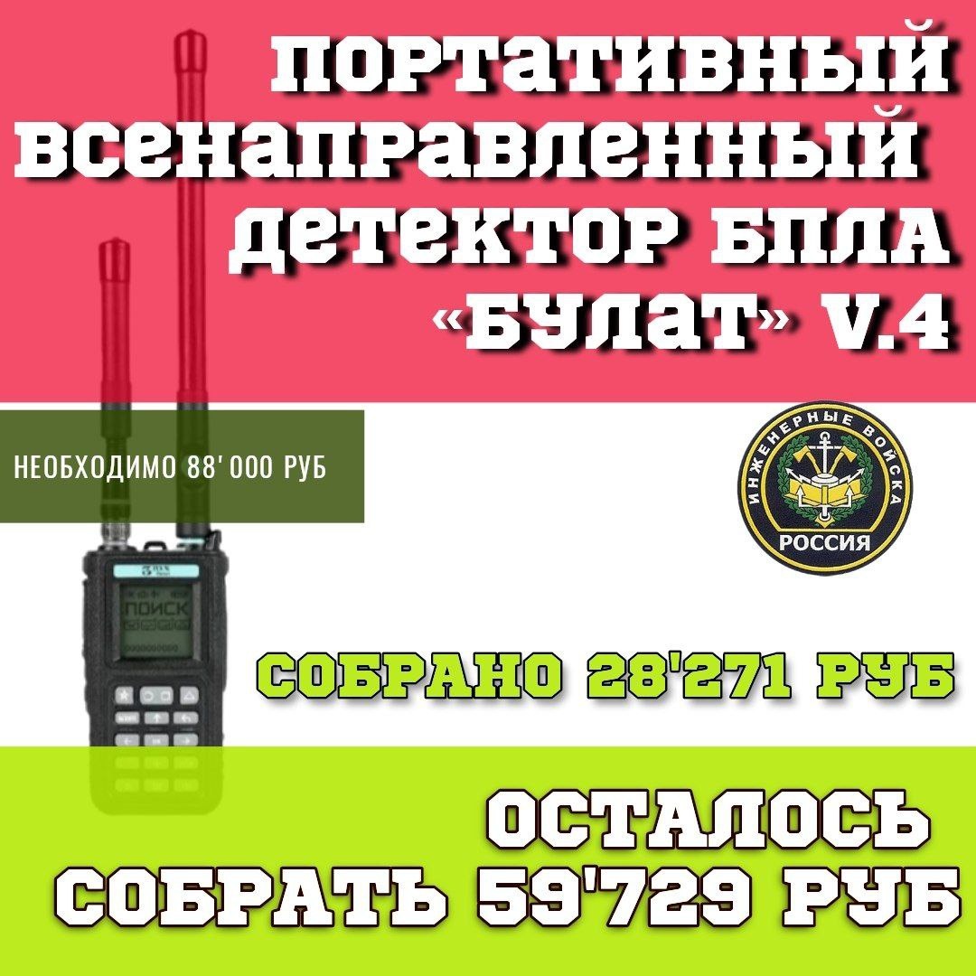 С началом новой рабочей недели, друзья!🙏 Отличный результат был вчера! Давайте продолжим в том же духе. Итак, продолжаем сбор на технику, от т которой зависит жизнь наших бойцов. ⬇️ ⬇️ ⬇️ Детектор БПЛА"БУЛАТ" v.4. 📌Сумма к сбору - 88'000 руб. 🔺Собрано - 28'271 руб. руб. 🔺Осталось собрать - 59'729 руб. Заказывать будем у производителя. Время изготовления с момента оплаты составит около 2 мес. ✔️Устройство БУЛАТ позволяет засечь беспилотный летательный аппарат на расстоянии до 1.5 км. Есть время принять меры! ✔️Детектирует все основные БПЛА. Просим максимального участия и поддержки! Любую посильную сумму можно перевести на номер карты 💳2202208188194204 или по номеру телефона 📞+79530562233 Получатель - Светлана Владимировна Л. ("Сбербанк") #уралсвоихнебросает #вместемысила