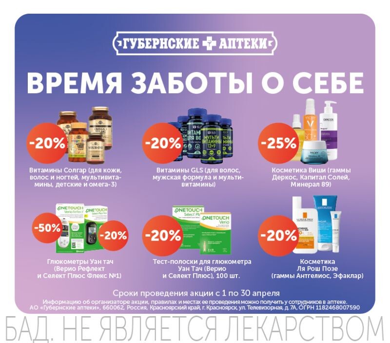 erid: F7NfYUJCUneRHyHoopj5 🎉Крупная сеть «Губернские аптеки» поздравляет со Всемирным днем здоровья и напоминает о снижении цен «Сеть «Губернские аптеки» желает вам крепкого иммунитета, бодрости, жизненного тонуса, а также чтобы ваш организм работал как часы!» — поздравляют жителей региона «Губернские аптеки». 💊В эти дни и до конца апреля в «Губернских аптеках» снижение цен на лекарственные препараты, БАДы, косметику и ряд других важных товаров, которые пользуются повышенным спросом населения. 🛍«Губернские аптеки» всегда заботятся о своих посетителях, помогая им найти всё необходимое для поддержания здоровья по более доступным ценам – в апреле снижение стоимости до 50% на многие товарные группы: - Медицинская техника - БАДы и витамины - Всё для бани - Лекарственные средства - Косметика - Ортопедические товары и многое другое! 📆Акция проходит с 1 по 30 апреля 2025 года и действует как в аптеках сети, так и в интернет-аптеке 24farmacia.ru. Реклама. АО "Губернские аптеки", ИНН: