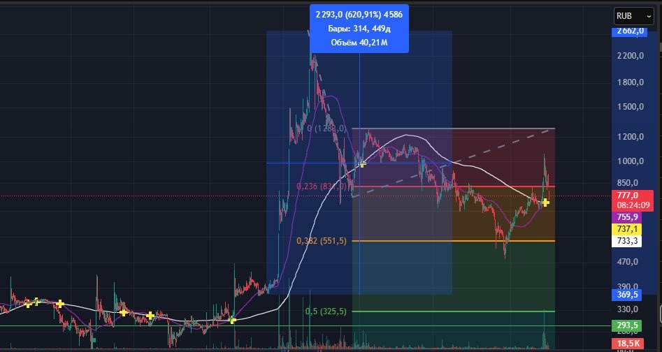 $NKHP 🔼В 2023 году цена выросла на 620% - это памп чистой воды. 📉Краткосрочный тренд нисходящий, цена за актив пытается вернуться к своей реальной стоимости. 🕯 Построил четыре волны, в данный момент строит пятую волну, Она обычно ниже, чем третья, поэтому цель графика 484 и обновление минимума. ✔️Сигналом для повышения цены будет пробитие 1293 и обновление вершины нисходящего движения - во что я не особо верю в ближайшее время. НЕ ИИР #теханализ #трейдер #инвестиции #нкхп