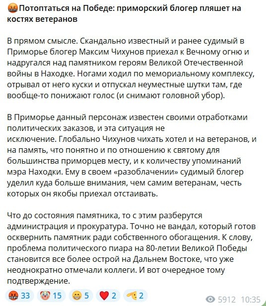 Политик и правозащитник Максим Чихунов опубликовал у себя в Telegram-канале проблему, подсвеченную жителями Находки — разбитый «Вечный огонь» мемориала «Боевая слава ТОФ». За это его осудили несколько других приморских пабликов, напомнив о «криминальном прошлом коммуниста». После жалобы на состояние памятника, Чихунов решил лично съездить в соседний город и сделать собственный репортаж. Мемориал оказался в плохом состоянии, но в мэрии города объяснили: ремонт будет, успеют до 9 мая. На сайте госзакупок торги уже прошли, правда завершились ничем — подрядчик так и не нашелся, а заявок на участие не поступило. Вопрос ремонта так и остался открытым. После ряда публикаций региональный следком заинтересовался историей и начал проверку, результаты огласят позже. А вот в Telegram-каналах про Чихунова появились посты, якобы он специально разводит конфликт, чтобы привлечь побольше внимания и дестабилизировать ситуацию в регионе. Но правозащитник с этим не согласился. «У меня живой телеграм-ка