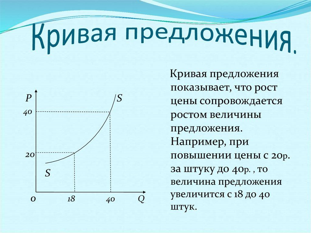 Предложение на рынке — это количество товаров или услуг, которые производители или продавцы готовы и способны предложить для продажи по определённой цене в течение заданного периода времени. Оно отражает зависимость между ценой товара и объёмом его производства. Основные особенности предложения: 1. Закон предложения: При прочих равных условиях, чем выше цена на товар, тем больше его готовы предложить продавцы, и наоборот. Это связано с тем, что рост цены стимулирует производителей увеличивать выпуск для максимизации прибыли. 2. Факторы, влияющие на предложение: - Цена товара (главный фактор). - Издержки производства (например, стоимость сырья или зарплаты работников). - Технологии (совершенствование процессов снижает затраты). - Налоги и субсидии (налоги уменьшают предложение, субсидии — увеличивают). - Количество продавцов на рынке. - Ожидания производителей (например, прогнозы роста цен в будущем). 3. Кривая предложения На графике она отображается как восходящая линия (чем выше цен