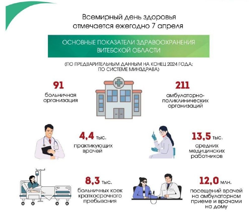 💚64% населения Витебской области удовлетворены состоянием своего здоровья 📊Такие данные приводят статистики области. ℹ️Еще больше интересной информации ко Всемирному дню здоровья, который отмечается сегодня, 7 апреля, смотрите в инфографике⤴️⤴️