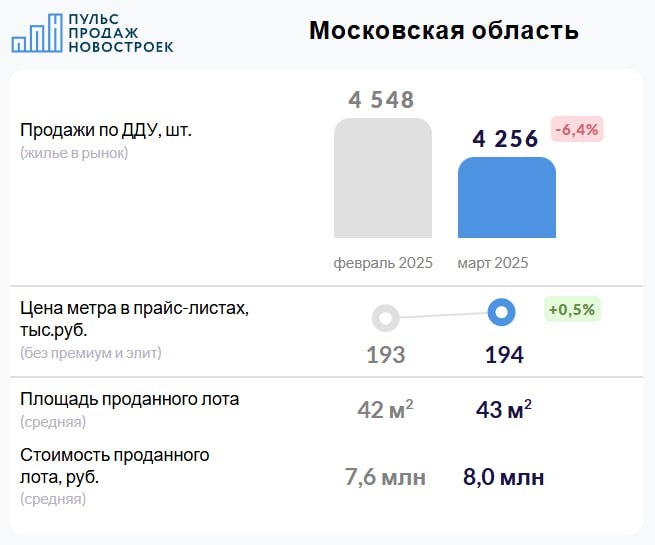Смотрите детальные графики, топ девелоперов и старты продаж февраля на нашем сайте https://pulsprodaj.ru/news/mart-2025-moskovskaia-oblast/