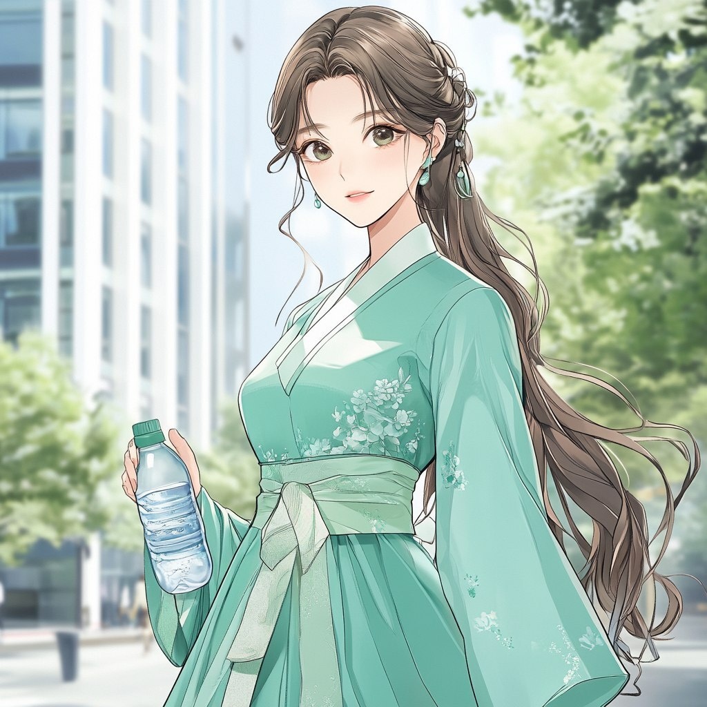 Создано на основе запроса: Korean webtoon style,Beautiful ultra detailed illustration of a gorgeous woman, posing by a white tall modern building. Her clothing is in mint color hanbok, a korea traditional clothes, both and decorative, emphasizing her form. She has long mint color hair and an elegant expression on her face, with soft features and striking eyes that draw the viewer in. She is holding a water bottle in one hand. This contrast between the fantastical character and the more traditional color scheme and elements gives the piece an intriguing narrative quality. --- Автоперевод: Корейский стиль веб -блюда, красивая ультра подробная иллюстрация великолепной женщины, позирующая белым высоким современным зданием. Красиво выглядит? 🤔 https://dzen.ru/id/65c0c65c86e4f837c27b24d7 #ИИ #AI #нейросеть #midjourney #art