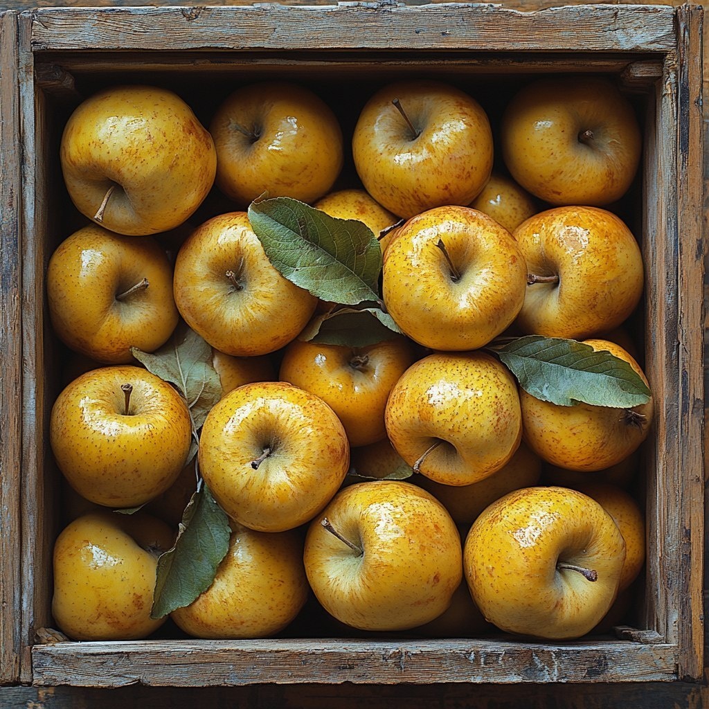 Создано на основе запроса: A top-down view of a box filled haphazardly with golden apples