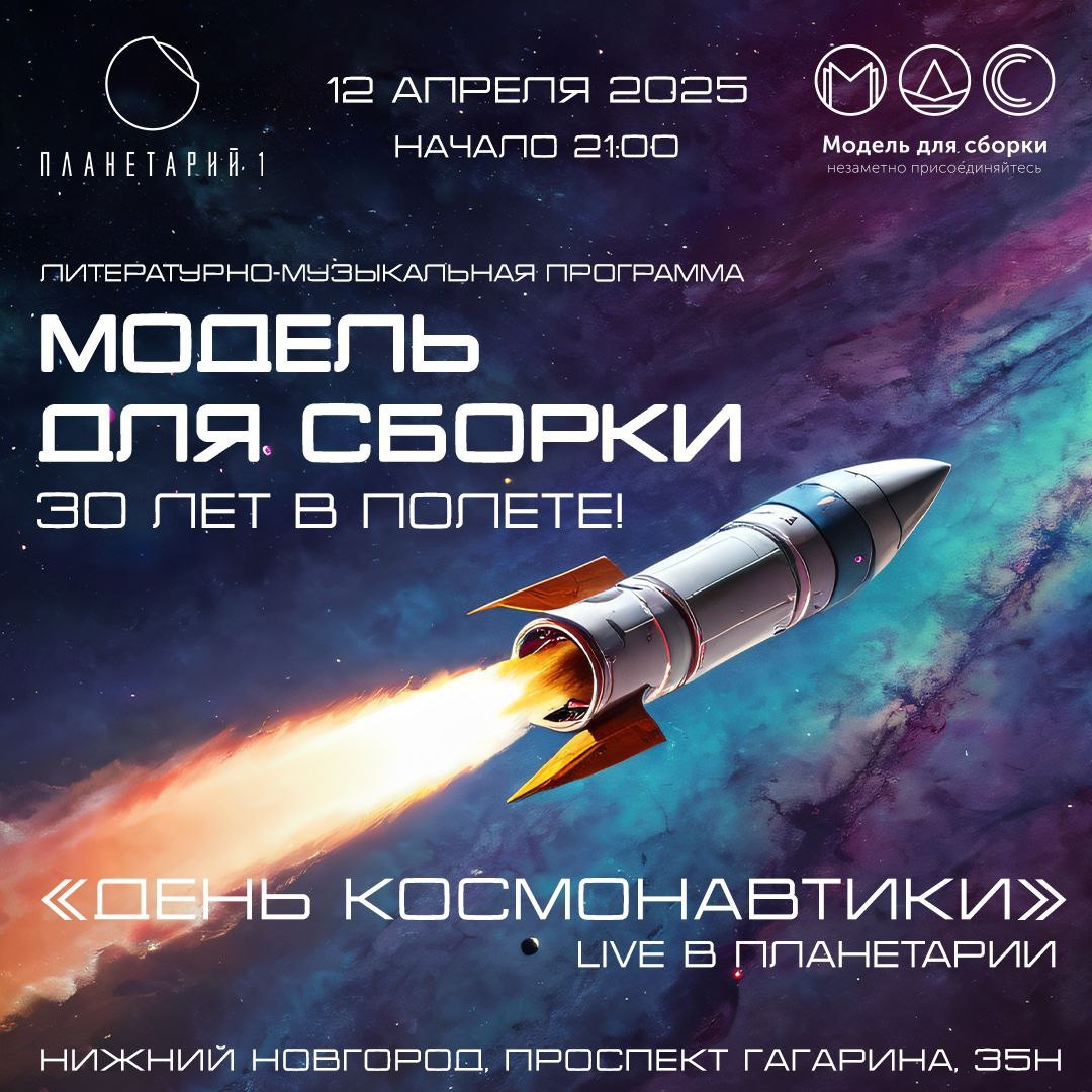 12 апреля в 21:00 — Live в Планетарии «День космонавтики». Модель для сборки 🛰 Литературно-музыкальный вечер в жанре космической научной фантастики. «Модель для сборки» — культовая российская радиопрограмма, подкаст — выходит в эфир с 1995 года. Суть «МДС» — аудиовизуальные постановки произведений фантастической литературы в сопровождении электронной музыки, тематического видео и мультимедиа. Главный чтец и ведущий — актер Влад КОПП. Мелодии звёзд создают музыкальные ведущие — DJ Михаил Габович / DJ Андрей Addison. Литературный редактор — писатель, член союза литераторов России Сергей Чекмаев. И пусть космическая экспансия не так стремительна, да и на Земле еще остается много нерешенных проблем, человек все равно будет мечтать о бездонном океане вселенной! А что может быть лучше, чем литература мечты? Классика фантастики и электронная музыка космоса — вот идеальный микс этой весны! 🎟Билеты — по ссылке Скидка 15% специально для подписчиков нашего канала по промокоду - Мероприяти