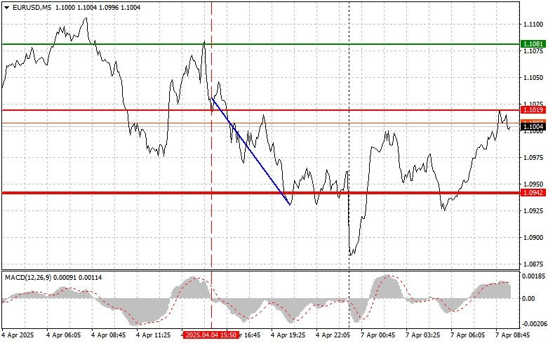 Тест цены 1.1019 пришелся на момент, когда индикатор MACD только начинал движение вниз от нулевой отметки, что стало подтверждением правильной точки входа на продажу евро. В результате пара снизилась в районе целевого уровня 1.0942.