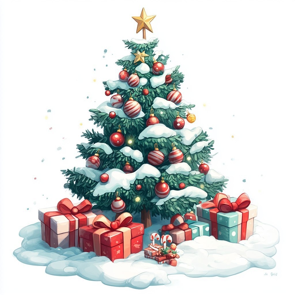Создано на основе запроса: Pixar style, high-quality digital illustration, white background. a small Christmas tree with candy toys, gifts.
