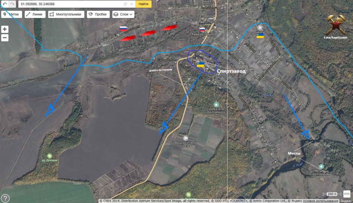 Суджанское приграничье. Гуево ВС РФ добивают противника в западном крыле поселка по улице Колхозная. Продвижение от здания Администрации сдерживается большой укрепленной промзоной Гуевского ликеро-водочного завода. И школой на улице Октябрьская. В районе мельницы Долгорукова есть небольшие мосты с выходом на сельскую дорогу к границе с Сумской областью. А основная логистика проходит через дорогу на Горналь. Пока идет медленное выдавливание ВСУ из поселка. Но есть интересные варианты. Как минимум идет перехват поставок от Горналя и мощные удары по сумскому Мирополью - хаб на границе. А зачистив полностью улицу Колхозную, у наших появятся дополнительные возможности для маневра на юг. Видится мне, что наступает перелом в битве за Гуево. схемы и карты