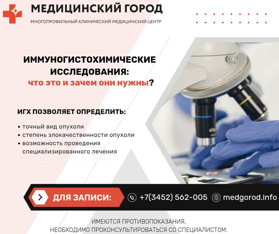 Иммуногистохимические исследования (ИГХ) – лабораторный метод исследования тканей под микроскопом, широко применяемый в патологической анатомии при диагностике доброкачественных и злокачественных новообразований. При ИГХ образец ткани опухоли обрабатывают специальными реактивами – антителами и окрашивают. Реакция позволяет достаточно точно поставить диагноз. ИГХ проводится практически при всех видах злокачественных образований. ИГХ – непростой и длительный процесс, который требует предельной внимательности специалистов и высококачественного диагностического оборудования. От точности выполнения исследования во многом зависит эффективность лечения. В составе Медицинского города функционирует Патологоанатомическое бюро, где работают опытные высококвалифицированные специалисты, которые проводят исследования на высокотехнологичном оборудовании, что гарантирует максимально достоверный и точный результат ИГХ. Более подробно об услугах , предоставляемых ГАУЗ ТО "МКМЦ "Медицинский город", и их