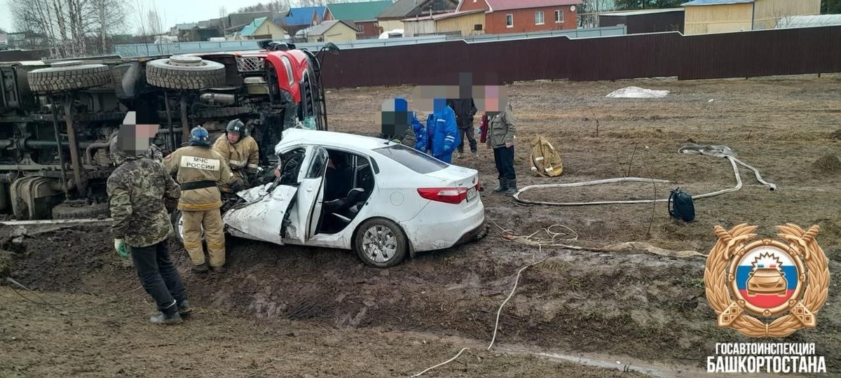 В Башкирии грузовик раздавил легковушку и перевернулся сам