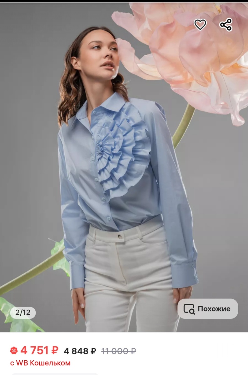 Блузка выполненная из 100% хлопковой ткани обеспечит вам комфорт даже в самые жаркие весенние дни. Блузка с объемным цветком на одной из полочек рубашки, станет отличным пополнение весеннего гардероба. Трендовый небесно-голубой цвет и натуральные материалы - это лучший выбор этой весной. А благодаря классическому крою рубашки, такая модель будет универсальной и подойдет как для офисных будней, так и для торжественных мероприятий.