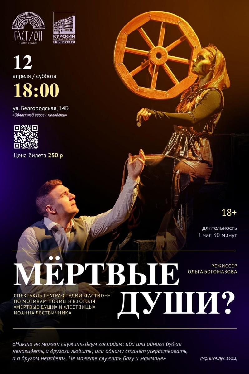 «Мертвые души?». Второй показ📜 12 апреля в 18:00 ул. Белгородская, 14Б (ОБУ «Областной Дворец молодёжи») Уже в эту субботу театр-студия «Гастион» покажет новый спектакль «Мёртвые души?» по мотивам одноимённой поэмы Н.В. Гоголя и «Лествицы» Иоанна Лествичника. Играет второй состав. 🔵Автор инсценировки и режиссёр-постановщик - Ольга Богомазова ⚫️Композитор - актёр театра-студии «Гастион» Иван Козупеев ✏️Подробнее о том, как попасть на спектакль в сообществе «Гастион». ❤️ КГУ | Подписаться