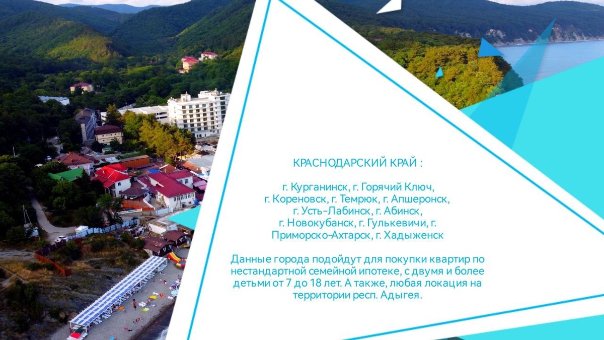 Данные города подойдут для покупки квартир по нестандартной семейной ипотеке, с двумя и более детьми от 7 до 18 лет. А также, любая локация на территории респ. Адыгея.