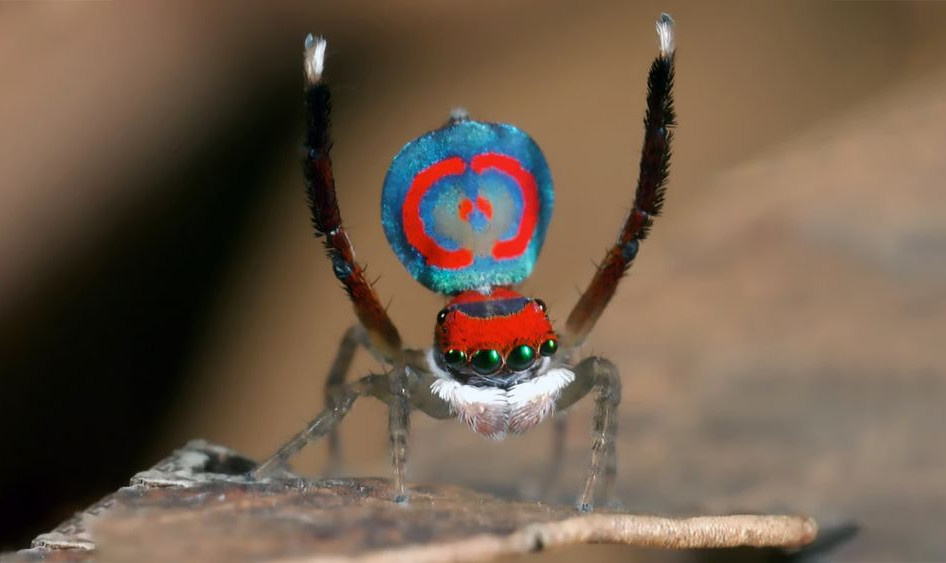 Крошечный австралийский паук-павлин (Maratus splendens) — настоящая находка для специалистов в области биомеханики. Передвигаясь прыжками, он испытывает в момент отрыва от земли перегрузки, которые и не снились пилотам сверхзвуковых истребителей — вплоть до 13 g. Особенности прыжка паука-павлина подробно изучили исследователи из Университета Маккуори (Сидней). Оказалось, что пауки прыгают не за счет сгибательных/разгибательных мышц — разгибательные мышцы у них отсутствуют. Их паукам-прыгунам заменяет совсем другая система. Перед прыжком они сокращают мышцы головогруди, чтобы протолкнуть гемолимфу (паучий аналог крови) к ногам. Гемолимфа создает давление на ноги, заставляя их быстро вытягиваться — стоит пауку «сбросить» давление, как ноги стремительно вытягиваются вперед, катапультируя его в воздух. Динамика прыжков у самцов и самок разная из-за отличий в размерах и форме тела. Изучив особенности прыжка 10 самцов и 12 самок, исследователи обнаружили, что основная нагрузка в прыжке прихо