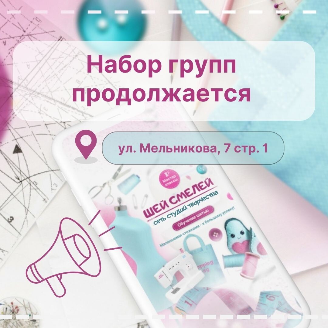 👋Отличной недели вам! ✨Дорогие родители, апрель - не повод останавливаться! 👌У вас есть прекрасная возможность записать вашего ребенка на увлекательные занятия по шитью и рукоделию в студию "ШЕЙ СМЕЛЕЙ"! Несмотря на окончание учебного года, мы рады принять новых учеников и помочь им раскрыть свой творческий потенциал. ✨ Рукоделие - это очень полезное и увлекательное занятие! ✨ В студии "ШЕЙ СМЕЛЕЙ" ваш ребенок научится создавать красоту своими руками, найдет новых друзей и проведет время с пользой и удовольствием! 📍Адрес филиала: ул. Мельникова, 7, стр.1, каб. 301, 3 этаж . ⏳Расписание: ⦁ 5-8 лет: Суббота 12:00-13:30 ⦁ 9-14 лет: Суббота 14:00-16:00 ⦁ 9-14 лет: Суббота 16:30-18:00 ⦁ 9-14 лет: Четверг 18:30-20:00 ✍️ Записаться можно тут➡️: ссылка на запись ❓ По вопросам обращайтесь в Отдел заботы Подробнее о наших услугах читайте на странице Вконтакте #ШейСмелей #Рукоделие #Мельникова #Запись