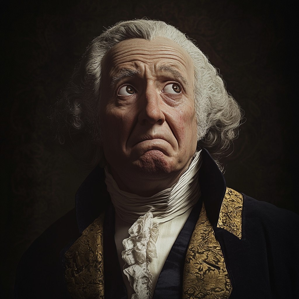 Создано на основе запроса: George Washington, humorous expression, missing teeth, looking uncomfortable, historical clothing, exaggerated