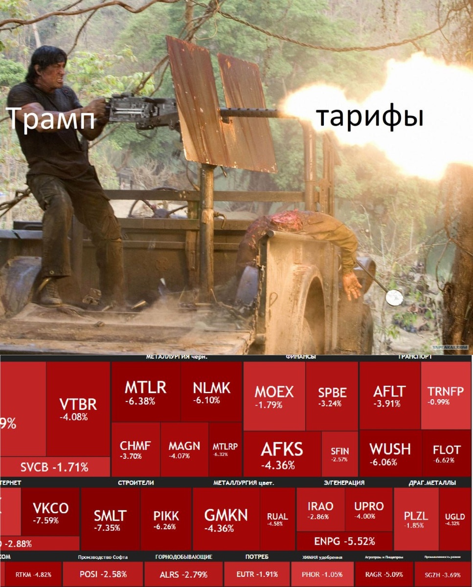 Трамп торпедировал российский фондовый рынок Торговая сессия открылась резким падением цены акций. ОФЗ теряют свою стоимость. Кто-то кричит: обвал! Но что если это возможность? 👉Акции на Мосбирже торгуются разнонаправленно. Акции МКБ растут на 5,5%. Все остальные вниз. • Акции ущербного Мечела теряют по 8% • Газпром оказался молодцом и теряет лишь 3,5%. Всё благодаря тому как он растерял стоимость заранее. • Акции Сбера попрощались с трактористом и ушли ниже на 15 рублей • Акции Самолёта спикировали до 1000 рублей, теряя за сегодня 10% • Акции металлургов инсультнулись по-разному: НЛМК на -7,2%, Севсталь на -6%, ММК на -5% • Роснефть пробивала минимумы 2024 года, в моменте падая до 416 рублей за акцию (-4%) • ВТБ ушёл к 69 рублям, теряя 4,3% 👉Сектор инноваций вообще размазало как что-то там по тарелке 👉Нефть Brent торгуется по 62,5$, доллар по 91,28, хлеб по 40. И всё это в нашем настоящем, в котором никто не ожидал беды. 👉Трамп на прошлой неделе ввёл тарифы на длинные список