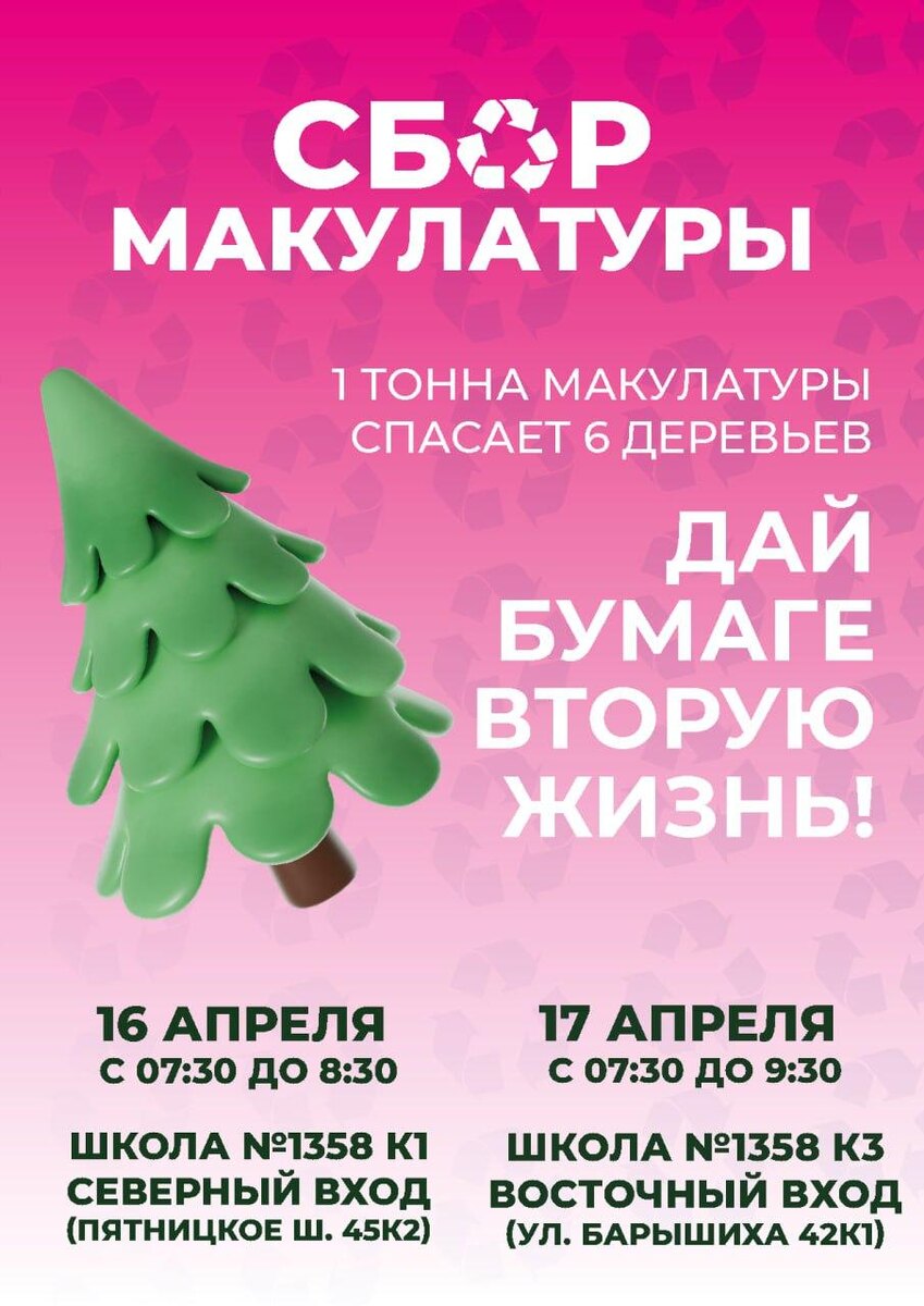 Традиционный весенний сбор макулатуры! 🌳 Приглашаем всех принять участие в экологической акции по сбору макулатуры! Пришла пора разобраться в бумагах и позаботиться о планете! Для вашего удобства сбор проходит на двух площадках нашей школы в два дня: ✅ 16 апреля на базе 1 учебного корпуса с 7.30 до 8.30 ✅ 17 апреля на базе 3 учебного корпуса с 7.30 до 9.30 Средства вырученные за макулатуру отправляются в благотворительные фонды столицы. Дайте бумаге вторую жизнь! #школа1358 #ДОНМ #ШколыКолледжиМосквы