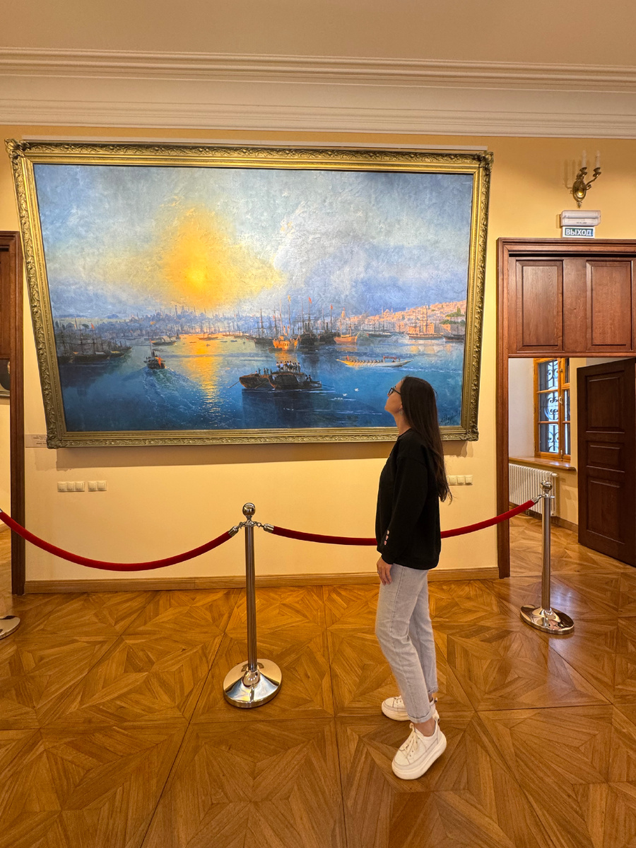 Давно хотели поехать в Феодосию и посетить картинную галерею. Тем более и повод отличный появился, так как 14 марта 2024 года состоялось торжественное открытие Феодосийской картинной галереи имени И. К. Айвазовского. Только представьте, в музее собрано 416 картин авторства этого известного художника-мариниста. Так что музей хранит самую большую коллекцию картин автора в мире. На этих выходных мы всё же собрались и поехали смотреть. Надо сказать, что благодаря трассе «Таврида», мы доехали из Симферополя до Феодосии за 1 ч. 20 минут. Раньше дорога занимала намного больше времени. Утром ехать было одно удовольствие. Машин мало, дорога ровная. Да и в самом приморском городе как-то машин оказалось не много. Мы спокойно припарковались на улице Галерейной, возле музея Грина и немного прошлись пешком к набережной, на проспект Айвазовского, где собственно и находится картинная галерея. Билеты купили с экскурсией. Стоимость взрослого билета — 500 р. А еще оказалось, что в последний понедельник