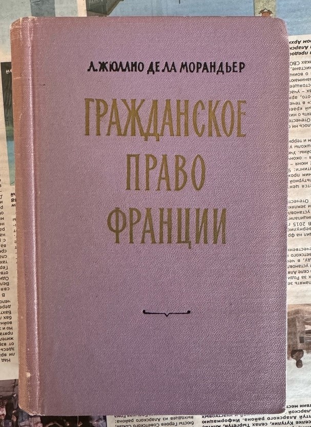 "Гражданское право Франции" Жюллио де ла Морандьера есть классический учебник по французскому гражданскому праву. Изучать современное гражданское право по данному учебнику не следует. По данному учебнику изучают общую теорию гражданского права. Учебником надлежит пользоваться вместе с переводом Французского Гражданского кодекса на русский язык (автор перевода профессор Иван Сергеевич Перетерский). Перевод учебника по французскому гражданскому праву выполнен профессором Флейшиц Екатериной Абрамовной. В предисловии автор говорит, что учебник полезен широкому кругу читателей-неспециалистов. Знакомство с общей теорией гражданского права необходимо каждому гражданину. Именно в рамках гражданского права сложились общие начала, лежащие в основе правового строя нашей цивилизации. Фото А. Е. З. Далее, смотреть торец: Фото А. Е. З. Титул: Фото А. Е. З. Есть нюансы на форзаце: Фото А. Е. З. В остальном все хорошо: И разворот: Фото А. Е. З